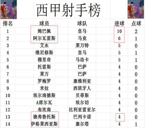 射手榜方面,姆巴佩和哈兰德现在是隔空较起了劲,哈兰德8轮打入11球,姆巴佩今天打入绝杀球后9轮打入10球,也上了双。西甲第2和英超第2都一样,阿尔瓦雷斯打入6球。维尼修斯,艾永和穆里奇5球并列第3。德弗鲁托斯今天梅开二度后,追上莱万,托雷斯等人4球刚好挤入前十。