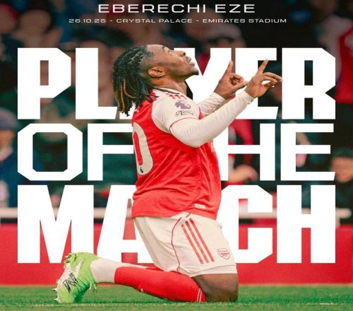 战旧主破门!阿森纳官方:埃泽当选对阵水晶宫最佳球员
