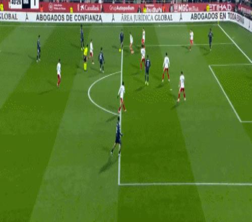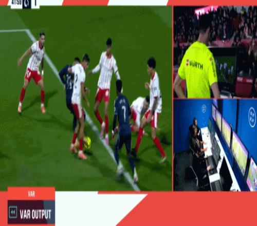 姆巴佩打入进球后,赫罗纳球员向裁判里卡多-布尔戈斯投诉,随后布尔戈斯接到VAR胡安-路易斯-普利多-桑塔纳的通知,称姆巴佩在射门得分前有手球嫌疑。